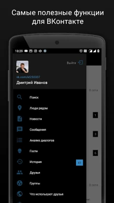 - Просмотр ленты, групп, друзей и расширенный поиск друзей Вконтакте