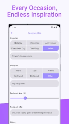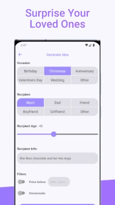 Gift Ideas understands that every gift should be special. That's why our app allows you to specify your preferences, including price range, recipient's interests, and even a homemade filter for those who cherish the personal touch. Let your heartfelt gestures shine through!