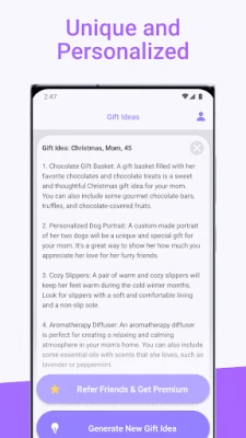 Gift Ideas isn't just smart; it's your ultimate source of creative inspiration! Whether you're seeking ideas for birthdays, Christmas, weddings, or any occasion, our AI-powered app will provide a plethora of unique and imaginative gift suggestions. Prepare to wow your loved ones with unforgettable surprises!