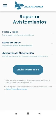 Esta App ofrece y permite: - Identificar a las principales especies de cetáceos - Disponer de información sobre los avistamientos e interacciones de las orcas - Consultar mapas con las zonas de más actividad de las orcas - Enviar información sobre avistamientos e interacciones de cetáceos - Informar sobre protocolos de seguridad en caso interacción