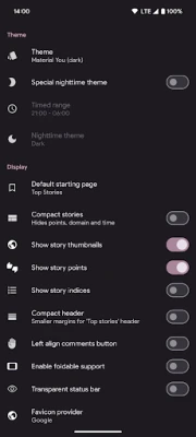 Highlights • Dark theme material design • Log in to comment, vote and submit posts • Customizable UI • Search • Smart link previews • Optional AdBlock • Tablet support • Switch between Top/Best/New categories • Fast comment loading • Share and bookmarks posts • Import/export bookmarks • AMOLED dark mode • Filter posts • Hide jobs posts • Optional thumbnails