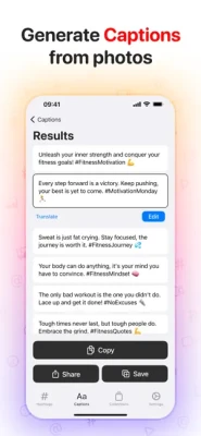 - Upload an image or snap a photo to create trendy and captivating captions