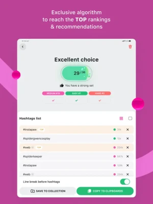 The special assistant Wizard will help gather a versatile set to achieve maximum audience coverage and a large number of instalikes. The collected sets of hashtags for instagram are conveniently stored in Collections for quick reuse. Get insta followers has never been so easy!