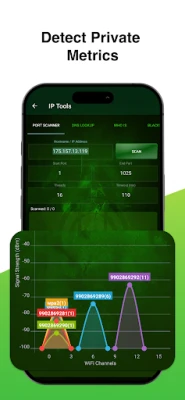 • Access Point Scan - Displays all router Access Points in range, including MAC addresses, channels, and dBm signal strength.
