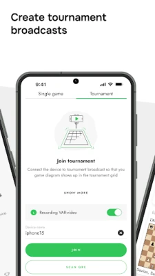idChess is based on computer vision and machine learning technologies. Using artificial intelligence, idChess recognizes chess pieces on the board and automatically records the chess notation of your game. To record and broadcast games, all you need is the idChess app installed on your smartphone and a tripod to securely mount your smartphone above the board. You can recognize games even offline. The idChess app does not require an Internet connection to digitize games.