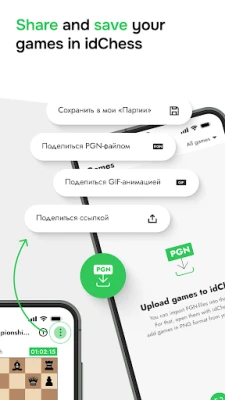 After completion, the game will be saved in the games library in the usual PGN or GIF format for chess players. Also, the app functions as a PGN viewer. The game recording will be available for sending to your coach via any convenient messenger, and it will also be possible to share the recording on social networks. For self-analysis of chess games, the Stockfish engine is built into the idChess mobile app. Even a child can handle the game analysis in the app! idChess highlights strong and weak moves in chess notation and ranks them by points. The app and our digital chess set are great helpers for chess kids, their parents, and coaches. Chess for children has never been so clear! idChess will be a great addition to the game of chess, as well as a chess timer/clock. It can replace a chess computer. Play chess with friends or a coach or analyze mistakes yourself in the idChess mobile app!