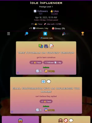 Master the art of online fame as you strategically click on powerful cards to enhance your likes and followers. Each card presents a unique challenge, requiring a delicate balance between increasing your social influence and managing stress levels.