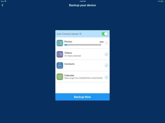 • Backup and restore contacts, photos, videos, and calendars with a single tap.