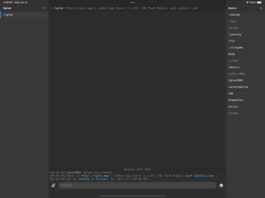 Introducing the new Igloo: a complete overhaul delivering an IRC Client with enhanced performance and stability. This latest version, reengineered from the ground up, offers a refined user experience while maintaining the simplicity and versatility you expect from Igloo.