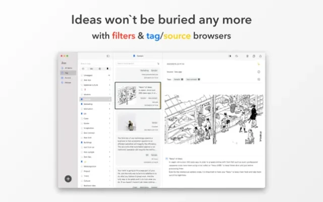 - Filters and Tag/Source browsers help you to find ideas instantly.
