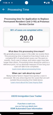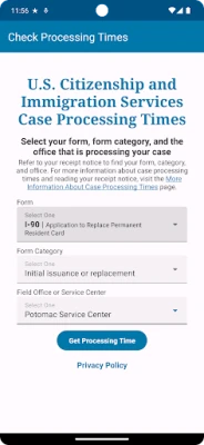 Tired of uncertainty? Say hello to confidence with the ability to check your Case Processing Time for USCIS with this app! Get the official USCIS data on case processing times right at your fingertips, available in both English and Spanish. Whether you're waiting for a visa, green card, or more, this app provides you with up-to-the-minute updates, ensuring you're always in sync with the latest processing trends.