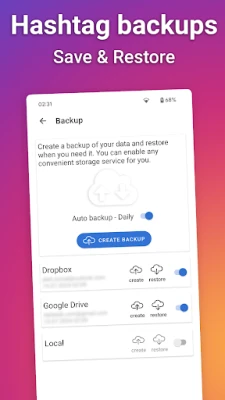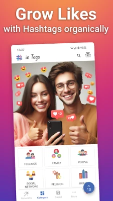 Each new card with hashtags can be saved in a special category and the cards can be sorted according to the date. Organizing cards into categories provides the functionality of a hashtag manager. Categories have predefined keywords in different languages that can be used in generator to follower boost.