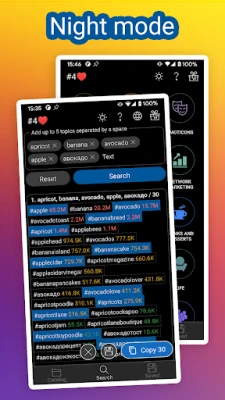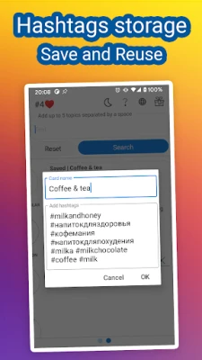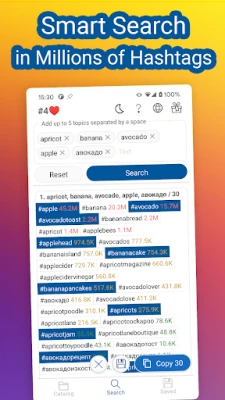 App has internal hashtag generator which provides search by topic, so you can find tags for likes. Then copy and paste hashtags to your publication (post) or video reels to boost real followers for your profile. You can add your own Hashtags stack and save it.