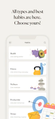 Habits Ideas: Discover new habits to track, meticulously organized for you based on 10 key life categories––perfect to help you get started.