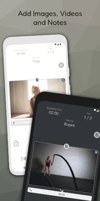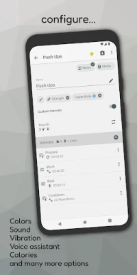The Interval Timer allows you to configure training sessions with preparation time, exercise time, rest as well as sets and workout repetitions Its also possible to create your own custom intervals. Each training phase can be easily identified by its own color and is introduced with an individual signal (sound, vibration or voice announcement). You can also add notes, pictures and even videos to your workout so that you can always follow the training process exactly. This way, you can always keep an eye on the clock and time your workout perfectly. The ideal addition to your fitness training plan.