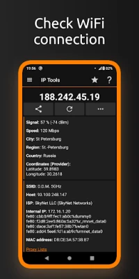 IP Tools has a simple interface, so you can receive within seconds full information about connection, find out local, internal or external address (with my IP), SSID, BSSID, DNS, ping time, Wi Fi speed, signal, broadcast address, gateway, mask, country, region, city, ISP provider’s geographical coordinates (latitude and longitude), whois, netstat and other basic information.