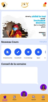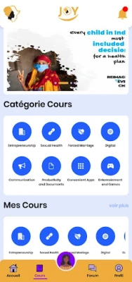 Joy est une application vous permettant d'avoir des notions complètes sur plusieurs thématiques d'actualités. Parmi ces thématiques, nous avons les violences basées sur le genre ,les mariages précoces, les Mutilations génitales féminines, la santé mentale. En plus de ces thématiques , l'application donne un accès a des cours de qualité sur l'entreprenariat, la sciences et le digital.