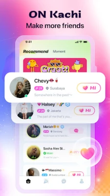 Kachi is a real and reliable social platform that allows you to easily meet new friends through text chat, video chat, and interactive voice rooms. All users are verified to ensure that everyone you meet is real and trustworthy, giving you a safer social experience.