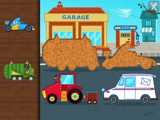 A fun puzzle game for toddlers and kids from ages 1 to 6 featuring 16 cartoon cars and construction vehicles such as race car, police car, school bus, tractor, fire engine, ambulance, garbage truck, excavator, transmixer, bulldozer and more in 20 shape & tangram puzzles!