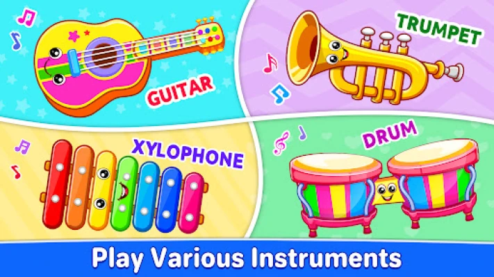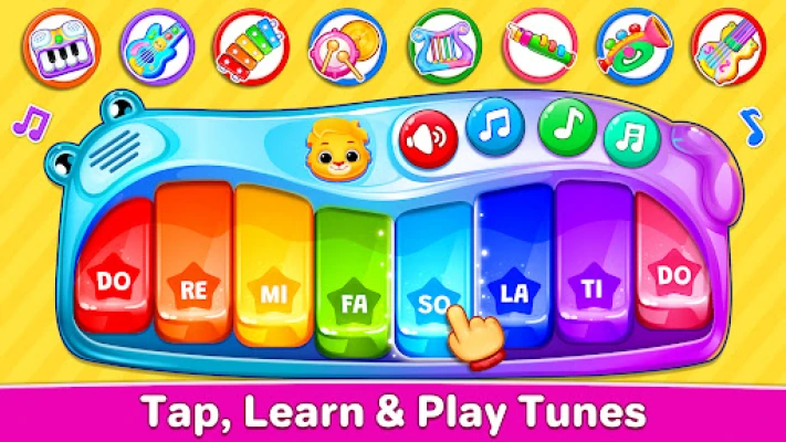 Kids can tap and play authentic-sounding instruments like piano, xylophone, drums, electric guitar, flute, trumpet, and saxophone. Whether they're playing a simple tune or experimenting freely, the easy touch interface lets little hands create music and enjoy endless piano fun. With realistic piano sounds, this is the perfect music game for baby musicians!