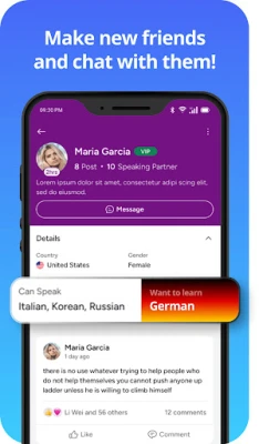 Connect with other students from around the globe and practice Spanish, English, Portuguese, and many other languages through our language learning app! Chat with native speakers, make friends, and enhance your conversational skills and your pronunciation.