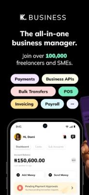 Kuda Business is an all-in-one business manager for freelancers and SMEs. Send estimates and invoices, make bulk transfers, and pay business bills on the Kuda Business app.