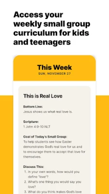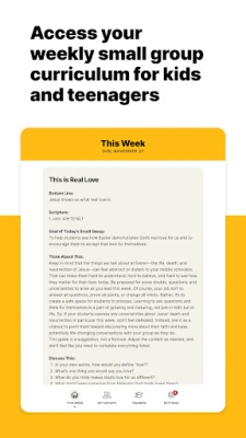 Access your Curriculum. Access your weekly small group curriculum for kids and teenagers so you can easily prep for what you’ll say before you say it.