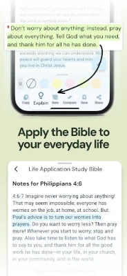 • One-Tap Insights: Instantly find the meaning behind any verse with the "Explain" feature or see how it reads across different versions with "Compare."