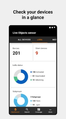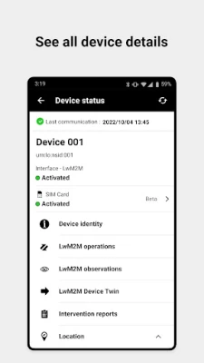 - display the status of a device and access to information (detail, MQTT/LoRa activity logs, payload messages, locations, intervention reports, traffic network and statistics,....)