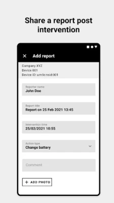 - handle and share intervention reports (pictures, comments, parameters...) for a device, stored locally into your mobile phone