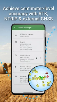 • Support for external GNSS receivers for highly precise data collection (Trimble, Emlid, Stonex, ArduSimple, South, TokNav...) and other devices supporting Bluetooth and USB connection