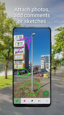 • Attachments: photo, video, audio, file, sketches, map screenshots