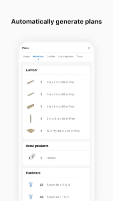 With MakeByMe, DIY plans have never been simpler. Interactive 3D assembly steps, stock materials, cut list and cut list diagrams are automatically updated as you design to help you start making and building your furniture. Some plan features are;