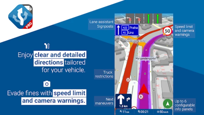 Routing and navigation is based on professional TomTom offline truck maps which contain advanced, truck-specific road data such as tunnel heights, bridge loads, narrow streets, and other large vehicle restrictions. Navigator avoids these restrictions and directs you accurately to your destination. TomTom truck maps are downloaded to your device (smartphone, tablet) so that you can navigate even without a data connection - i.e. Navigator Truck Pro can be used for offline navigation using only the GPS.