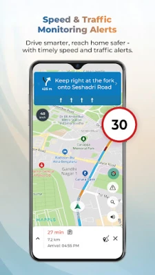 • Get safety alerts like speed breakers, Potholes, Traffic cameras, Accident prone areas while navigating.