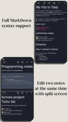 ✌️ Dual Note Editing: Edit two markdown notes simultaneously with a split screen view and multitask effortlessly.