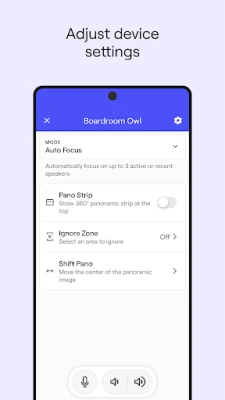 - Select and adjust device settings: Choose from different settings to customize your meeting experience. Options to ignore sections of the room, turn off 360-degree panoramic strip, and more.