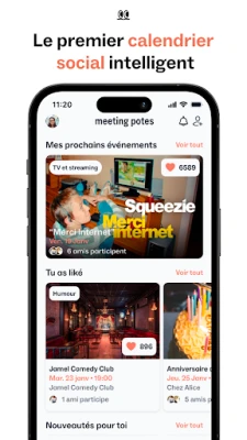 Avec Meeting Potes, ton calendrier personnel devient un calendrier social intelligent. Synchronise tes agendas personnels pour organiser ton temps libre, et découvre instantanément des événements intégrés à ton calendrier en fonction de tes centres d'intérêts et de tes disponibilités.