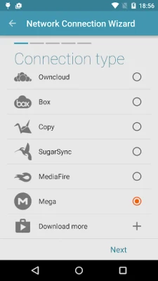 In order to connect to Mega, follow these steps: 1. Tap the + button 2. Choose "Cloud connection" 3. Select Mega option 4. Enter you login and password 5. Tap connect. Tap again to open your cloud drive.