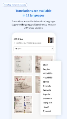 Korean, English, Chinese (Simplified), Chinese (Traditional), Japanese, German, French, Spanish, Indonesian, Vietnamese, Arabic and Russian.