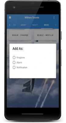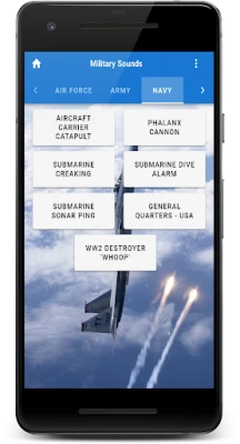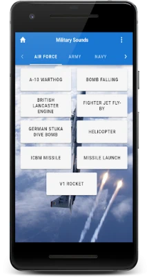 The Military soundboard is here! With over 30 sounds that you might hear while at war, in a movie, or even at an air show. These realistic sounds are as authentic as it gets. Better yet, why not make one of them your ringtone, alarm, or notification sound!