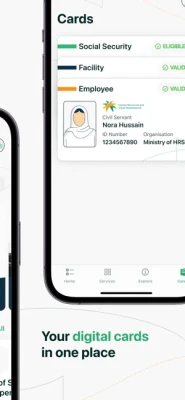 Cards: You can access your digital wallet containing cards including: Public Sector Employee Card, Private Sector Employee Card, Freelance Card, Facility Card for Disabilities, Privilege Card, and Social Security Beneficiary Card. you can view your data and hide it for more data protection and info security.