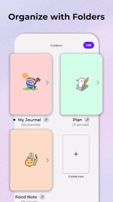 Organize your thoughts in themed journals. Choose from cute icons and create custom notebooks for self care, goals, habits, or reflections.