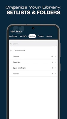 • Organize your sheet music into set lists for lessons, recitals, or group practice