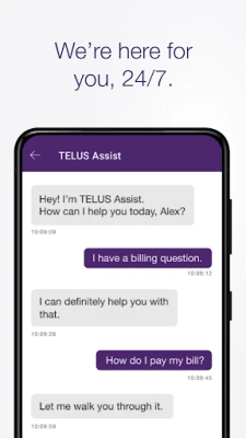 Plus, enjoy the added security of logging in with 2-step verification, and facial or fingerprint recognition. Have a question? Get support with our TELUS Assist chatbot 24/7, even while you’re on the go.