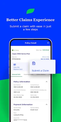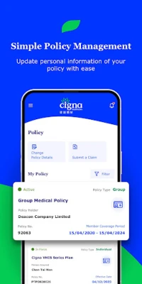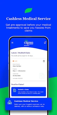 • View and manage your policies • Apply for pre-approval of Cashless Medical Service before treatment, easing your mind on managing paperworks for claims • Submit claims and track status • Enroll new health protection and medical inurance coverage plans online for you and your family • Locate nearby network healthcare professionals • Get live support from Cigna's Customer Service Team