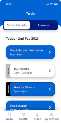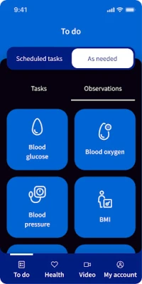 In your MyHealthAccess app, you can easily access tasks scheduled for you by your care team, connect with your provider on video call, monitor your own vitals and readings as often you like, and access your results and health data at your convenience.