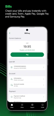 • Receive your latest bill and pay instantly with credit card, TWINT, Apple Pay, Google Pay and Samsung Pay.
