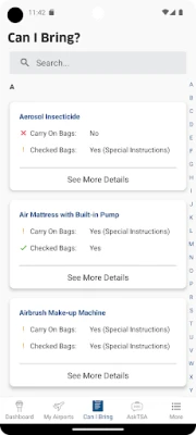 + Quickly search which items you can bring with you through the checkpoint onto the airplane. + Request live assistance from TSA through the AskTSA social media integration. + Check how historically busy the airport will be on your specific day and time of travel. + Check crowd-sourced TSA security checkpoints wait times at the airport of your choice. + Add your own TSA security checkpoints wait time for others to see (NOTE: You must be at the airport in order to report wait times). + Check the delay information and current weather conditions at your favorite airports nationwide. + Consult the TSA Guide on how to prepare for and get through the security checkpoint quickly. + Discover which airports and airlines support TSA PreCheck®, and learn how to sign-up.