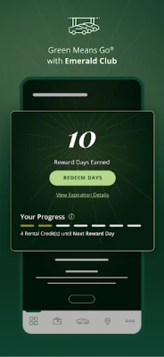 • Manage your Emerald Club profile, view your progress to the next Emerald Club tier and credits toward free rental days (covers base rate, Time and Mileage, only).